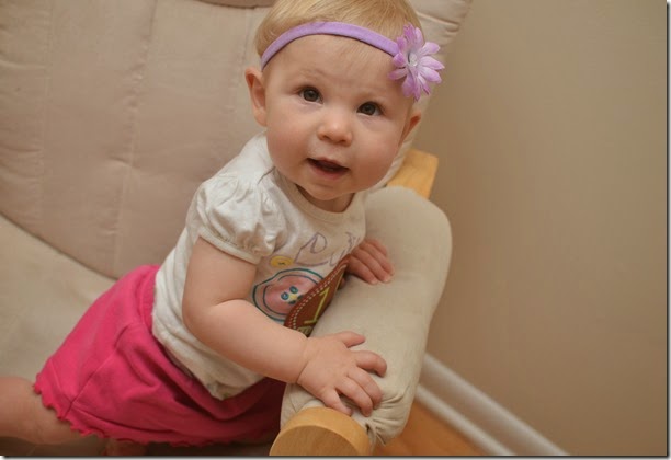 Paige is pulling up everywhere now, and cruising just a little. She is not climbing stairs yet, but she’s close. I’m having an internal argument about how many baby gates we should put up; since we have 2 staircases, we could feasibly put up 4 gates (top and bottom of each), but is it necessary? Currently, we have one up.