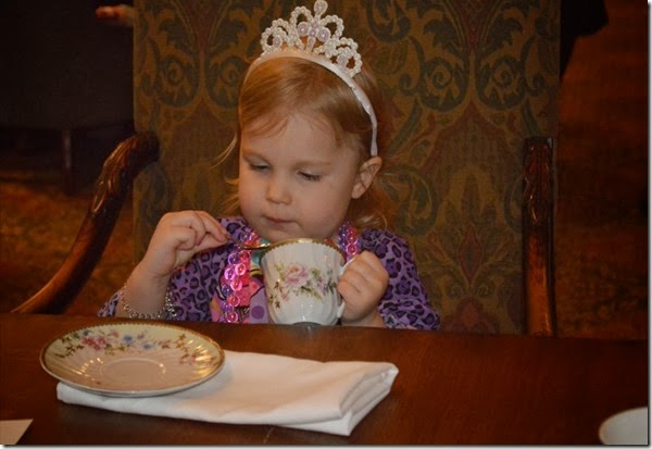 Meredith is very into princess Sofia (as is probably obvious by her Halloween costume and Christmas presents this year). Princess Sofia has tea parties. Meredith has always loved a pretend tea party herself, so I wanted to try her at a real English-style tea. There is a nice hotel here that serves tea every afternoon by reservation only. I told Meredith that we were going to a “fancy tea party” and she was so excited! Mimi and Aunt Meghan were in town, so they and Grandmother joined us.